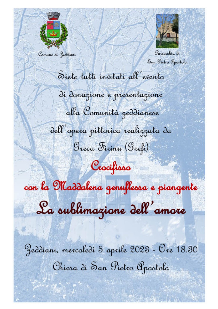 Mercoledì 5 aprile, alle 18.30, presso la Chiesa parrocchiale di San Pietro Apostolo, avrà luogo l’evento di presentazione e donazione alla comunità zeddianese dell’opera pittorica realizzata dall’artista nostra compaesana.