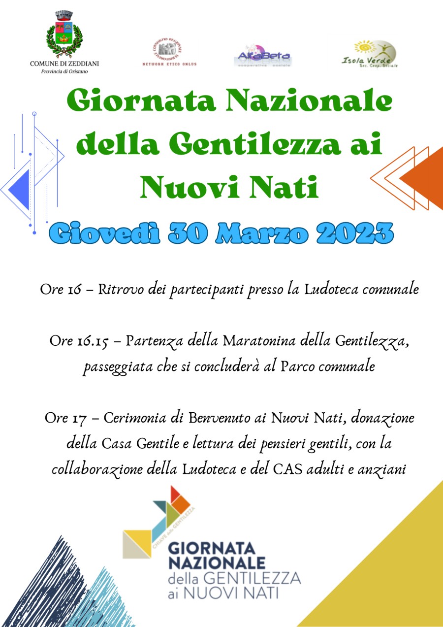 Anche quest’anno il Comune di Zeddiani ha aderito alla Giornata Nazionale della Gentilezza ai Nuovi Nati, iniziativa con la quale si accoglieranno simbolicamente nella nostra comunità i bambini nati nel 2022.