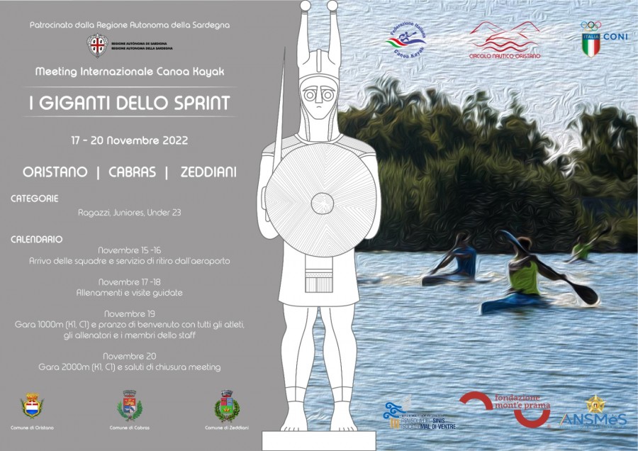 Il Circolo Nautico di Oristano promuove un meeting internazionale di canoa kayak denominato “I Giganti dello Sprint”, che si svolgerà nei giorni dal 17 al 20 novembre 2022. All’iniziativa, patrocinata dalla RAS, dai comuni di Oristano, Cabras e Zeddiani, dall’Area Marina Protetta Penisola del Sinis – Isola di Mal di Ventre, dall’ANSMeS (Associazione Nazionale Stelle, Palme e Collari d’Oro al Merito del Coni e del Cip) e dalla Fondazione Mont’e Prama, saranno presenti squadre di canoa-kayak provenienti dal resto d’Italia ed europee, oltre ovviamente alle squadre della nostra regione.