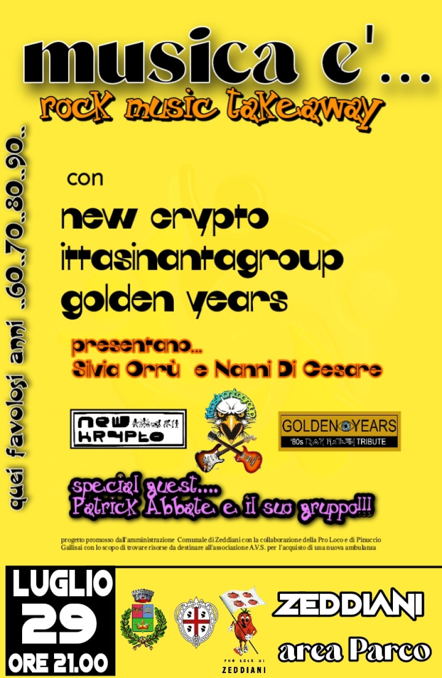 Il Comune di Zeddiani, in collaborazione con la Pro Loco e con Pinuccio Gallisai, propone un concerto di beneficenza dedicato alla musica degli anni 60 – 70 – 80 e 90. L’ingresso sarà a offerta e con il ricavato, che verrà devoluto all’AVS di San Vero Milis, si contribuirà all’acquisto di una nuova ambulanza.