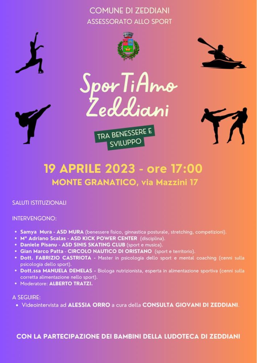 L’Assessorato allo Sport, in collaborazione con le Associazioni Sportive Dilettantistiche di Zeddiani ed altre operanti nel territorio, la Consulta Giovani, e con la partecipazione del servizio Ludoteca, promuove un evento finalizzato alla promozione del benessere psicofisico derivante dalla pratica sportiva.